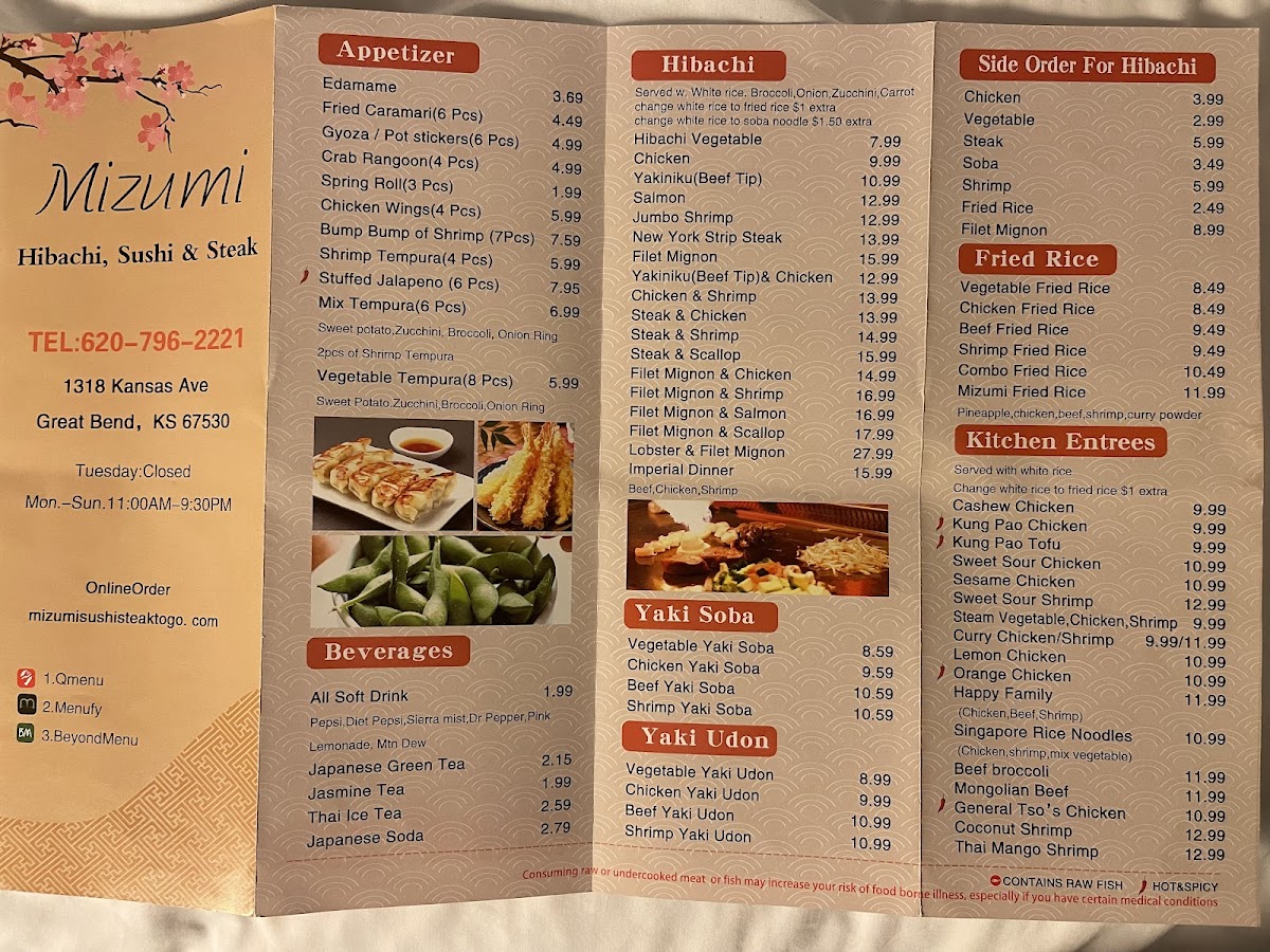 Welcome to Mizumi Sushi & Steak, where culinary excellence meets a tranquil atmosphere in Great Bend, KS. Their carefully crafted menu showcases a harmonious blend of flavors, offering an array of delightful appetizers such as Edamame and Fried Calamari, alongside succulent steak options like the Filet Mignon and Lobster.